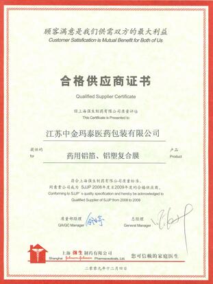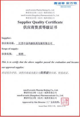 一直以來中金瑪泰始終秉承對客戶負(fù)責(zé)的使命,把為客戶提供最優(yōu)質(zhì)的產(chǎn)品和服務(wù)作為不懈追求。公司通過強(qiáng)化質(zhì)量管理,提升服務(wù)水平,為客戶提供最安全、放心的產(chǎn)品。近日,我公司先后被上海強(qiáng)生制藥有限公司、賽諾菲安萬特(北京)制藥有限公司、賽諾菲安萬特(杭州)制藥有限公司等多家客戶評為2009年度合格供應(yīng)商,并被頒發(fā)合格供應(yīng)商資質(zhì)證書。