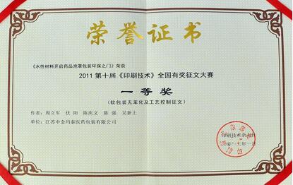 2012年1月,由本公司周立軍、伏陽、陳慶文、陳強(qiáng)、吳新上等五位科技人員撰寫的論文《水性材料開啟藥品泡罩包裝環(huán)保之門》榮獲2011第十屆《印刷技術(shù)》全國有獎(jiǎng)?wù)魑拇筚愐坏泉?jiǎng)。 軟包裝無苯化已成為不可逆轉(zhuǎn)的潮流。這篇論文是上述科技人員在本公司實(shí)行無苯化進(jìn)程中的獨(dú)到見解和心得體會(huì),深受專家評(píng)委好評(píng)。本篇論文是該主題全國唯一的一個(gè)一等獎(jiǎng)。