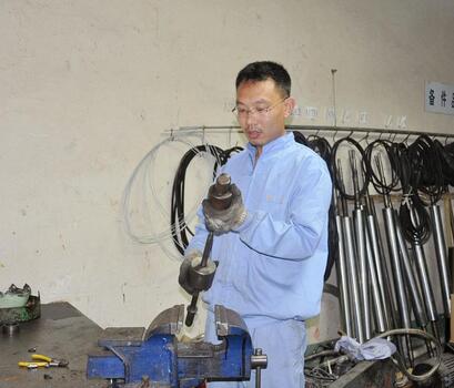 一工廠的印刷涂布機是公司最早引進的主要設備,為公司的發(fā)展壯大立下了汗馬功勞。常年滿負荷生產(chǎn),使印刷機需要維護的地方越來越多。印刷機冷卻輥的旋轉接頭,就是個容易損壞的部件。由于旋轉接頭前端需要進冷卻水,它的一端就被設計成盲孔,所以旋轉接頭內(nèi)部的軸承更換是個麻煩的事情:軸承外環(huán)卡在旋轉接頭內(nèi)很難取出!以前的老辦法是敲打旋轉接頭或者在軸承環(huán)上電焊上鋼筋,再依靠拉鋼筋取出軸承環(huán)。這樣的辦法麻煩、費時,而且極容易損壞銅質的旋轉接頭。張歡通過觀察軸承環(huán)的形狀特點,想到了漲緊取環(huán)法。他用鋼珠、環(huán)體、螺桿、鐵塊,自制了軸承環(huán)取出專用工具。他先把環(huán)體裝在軸承環(huán)內(nèi),旋轉螺桿、拉緊坡度圓塊,漲起的鋼珠頂住軸承環(huán)后,再往下敲打鐵塊,就能輕易地取出了軸承環(huán)。這個工具用奇思妙想來形容,絕不為過!因為有了這套專用工具,使旋轉接頭里軸承環(huán)的取出,變的極其便捷,縮短了維修時間。特別是旋轉接頭也完好如初,不再有敲打的痕跡了。