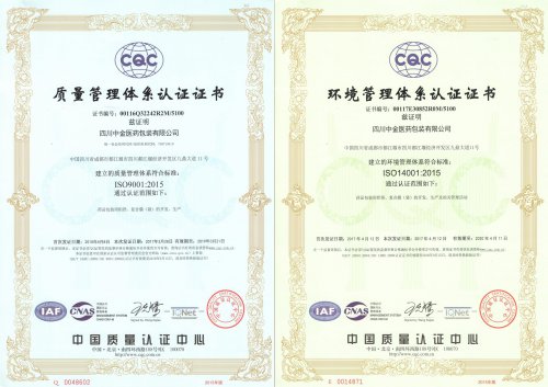 近日,四川中金醫藥包裝有限公司收到了由中國質量認證中心頒發的《ISO90012015質量管理體系認證證書》、《ISO14001:2015環境管理體系認證證書》,這也標志著四川中金已建立起一套標準化、規范化的質量、環境管理體系,公司在生產運營管理、產品質量、市場銷售、客戶服務等方面得到全面的提升。