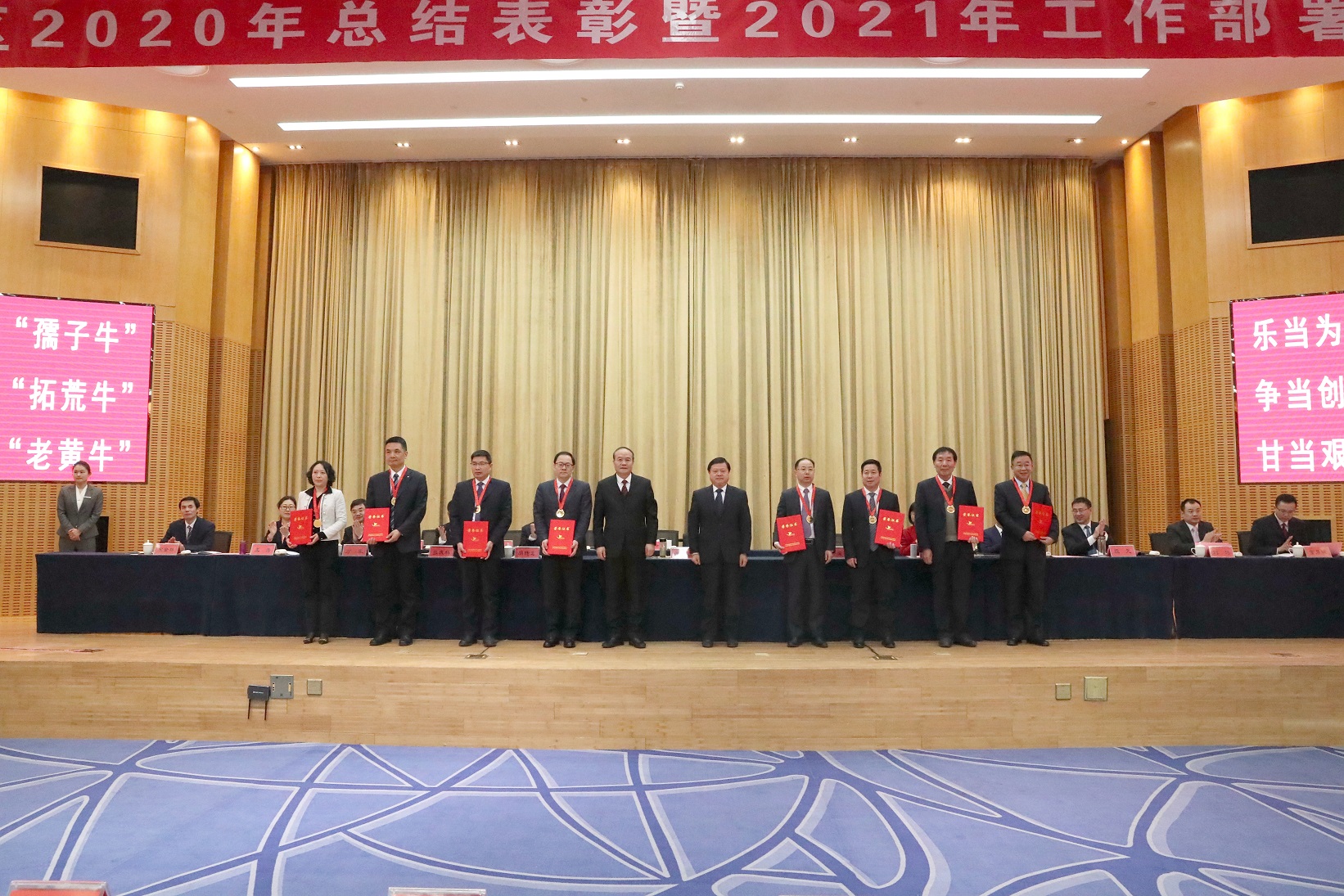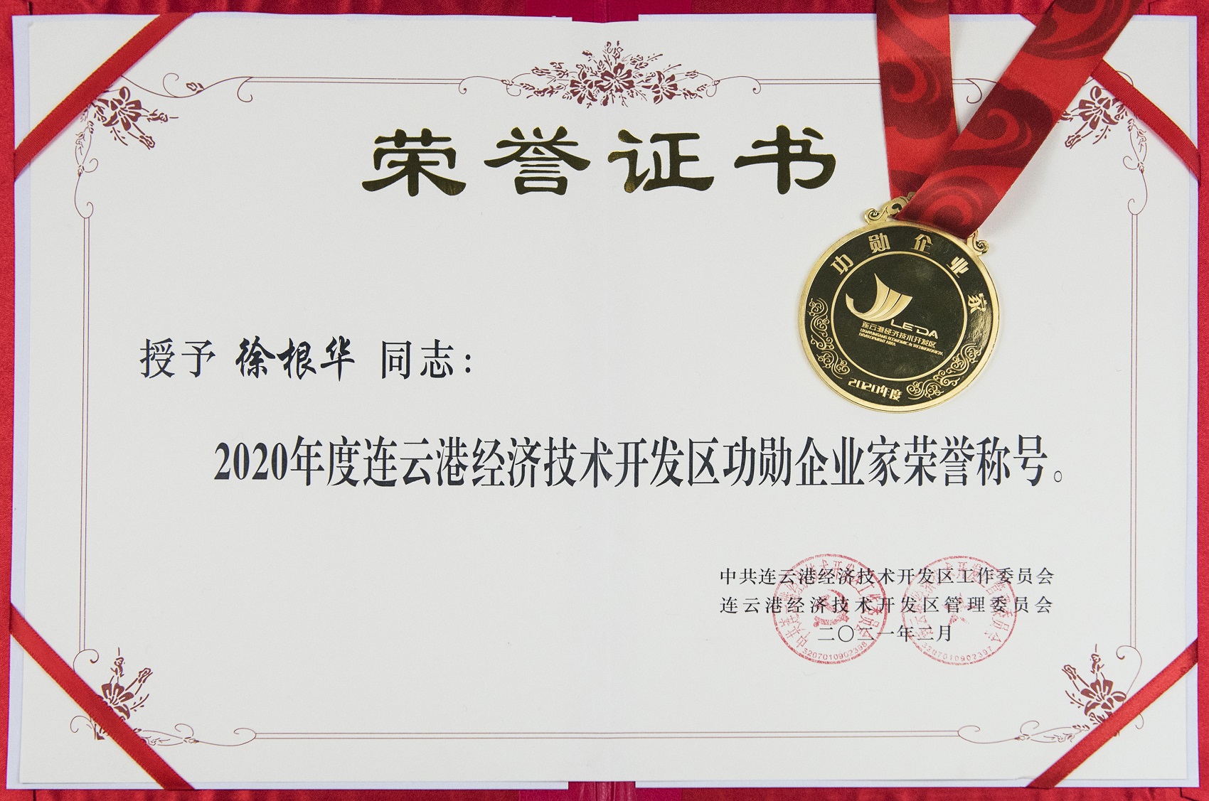 表彰會上,我公司總經理徐根華榮獲“2020年度連云港經濟技術開發區功勛企業家”榮譽稱號,“中金工匠”于在江被評為全區企業“愛崗敬業員工”榮譽稱號。